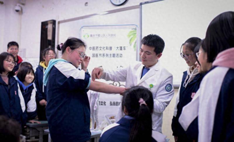 在重庆璧山区,专家志愿者走进校园,为同学们展示通过针灸疗法提高代谢帮助减重。新华社发(胡悦建 摄)