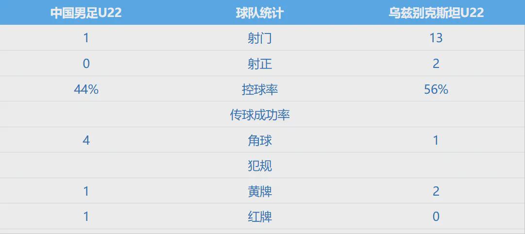 此时,中国队已然少一人作战,而对手的攻势一浪高过一浪。在全场比赛射门对比1比8的绝对劣势下,U22国足顽强地守住了0-0的平局。